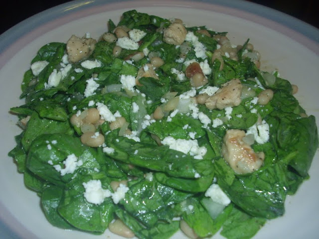 Yesterday I really wanted to try out that Feta cheese on a salad with the organic baby spinach I bought. So to the spinach I added a ladle full of the white chicken chili I made Monday night. I diced up some sweet onion & sprinkled with Feta cheese, a little sea salt and pepper.