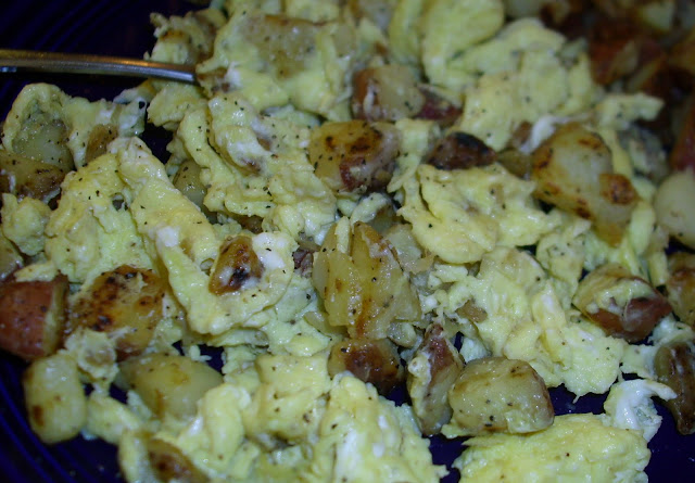 When the potatoes are ready I put them aside. Then as I make each portion I butter my medium non-stick skillet, with the stove setting on about 6 or 7. The pan needs to be hot for the eggs to set on the bottom quickly, but not overly hot so they brown. Then I add a scoop of the potatoes scattered a bit in the pan and pour in a bit of the eggs (enough to coat the bottom plus whatever serving size you want). Quickly move the pan around so the eggs swirl around the edges. Add salt and pepper. Then scrape the eggs through the middle and turn the pan so more eggs from the top coat the bottom of the pan.